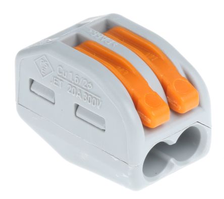 CLASSIC conector rapido con palancas de 2 polos. Capacidad de conexión: 0.08-4mm2/28-12AWG. Indicado para una carga de 32A a 400VCA. Conexión: Cage clamp. Color: Gris. Paquete de 20 piezas