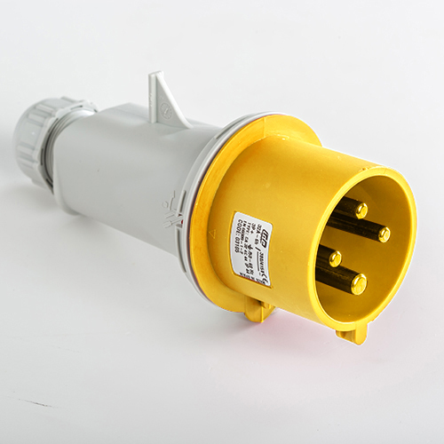 Clavija aérea. Corriente nominal: 32A a una tensión de trabajo de 120VCA. Configuración de contactos: 3P+T. Código horario: 4h, color amarillo. Resistencia impacto: IK08. Material: poliamida 6 HF, cumple la directiva RoHS. Material contacto: latón. Grado de proteccón: IP44.