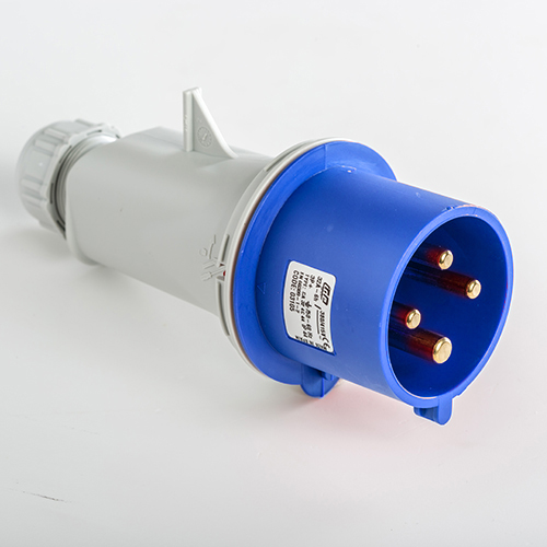 Clavija aérea. Corriente nominal: 32A a una tensión de trabajo de 230VCA. Configuración de contactos: 3P+T. Código horario: 9h, color azul. Resistencia impacto: IK08. Material: poliamida 6 HF, cumple la directiva RoHS. Material contacto: latón. Grado de proteccón: IP44.