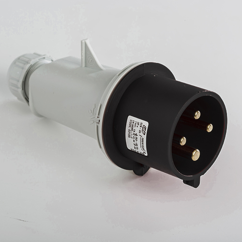 Clavija aérea. Corriente nominal: 32A a una tensión de trabajo de 500VCA. Configuración de contactos: 3P+T. Código horario: 7h, color negro. Resistencia impacto: IK08. Material: poliamida 6 HF, cumple la directiva RoHS. Material contacto: latón. Grado de proteccón: IP44.