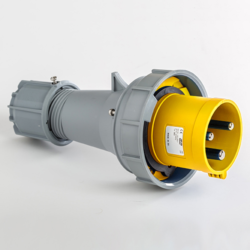 Clavija aérea. Corriente nominal: 63A a una tensión de trabajo de 120VCA. Configuración de contactos: 2P+T. Código horario: 4h, color amarillo. Resistencia impacto: IK08. Material: poliamida 6 HF, cumple la directiva RoHS. Material contacto: latón. Grado de proteccón: IP66-IP67.