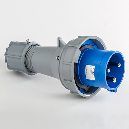 Clavija aérea. Corriente nominal: 63A a una tensión de trabajo de 230VCA. Configuración de contactos: 2P+T. Código horario: 6h, color azul. Resistencia impacto: IK08. Material: poliamida 6 HF, cumple la directiva RoHS. Material contacto: latón. Grado de proteccón: IP66-IP67.
