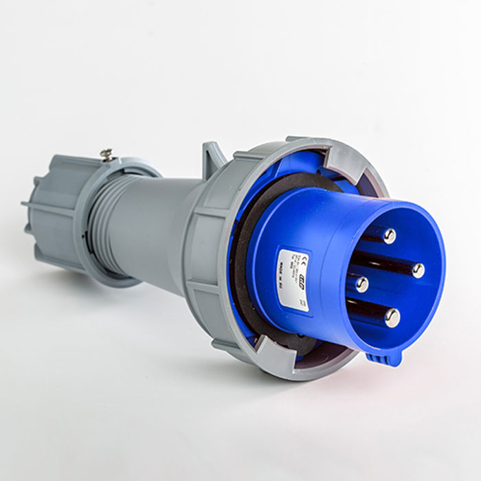 Clavija aérea. Corriente nominal: 63A a una tensión de trabajo de 230VCA. Configuración de contactos: 3P+T. Código horario: 11h, color azul. Resistencia impacto: IK08. Material: poliamida 6 HF, cumple la directiva RoHS. Material contacto: latón. Grado de proteccón: IP66-IP67.