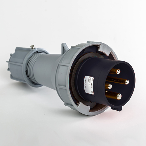 Clavija aérea. Corriente nominal: 63A a una tensión de trabajo de 500VCA. Configuración de contactos: 3P+T. Código horario: 7h, color negro. Resistencia impacto: IK08. Material: poliamida 6 HF, cumple la directiva RoHS. Material contacto: latón. Grado de proteccón: IP66-IP67.