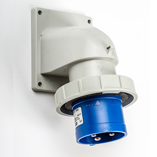 Clavija empotrar acodada. Corriente nominal: 32A a una tensión de trabajo de 230VCA. Configuración de contactos: 2P+T. Código horario: 6h, color azul. Resistencia impacto: IK08. Material: poliamida 6 HF, cumple la directiva RoHS. Material contacto: latón. Grado de proteccón: IP67.