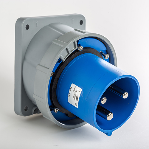 Clavija empotrar inclinada. Corriente nominal: 125A a una tensión de trabajo de 230VCA. Configuración de contactos: 2P+T. Código horario: 6h, color azul. Resistencia impacto: IK08. Material: poliamida 6 HF, cumple la directiva RoHS. Material contacto: latón. Grado de proteccón: IP66-IP67.