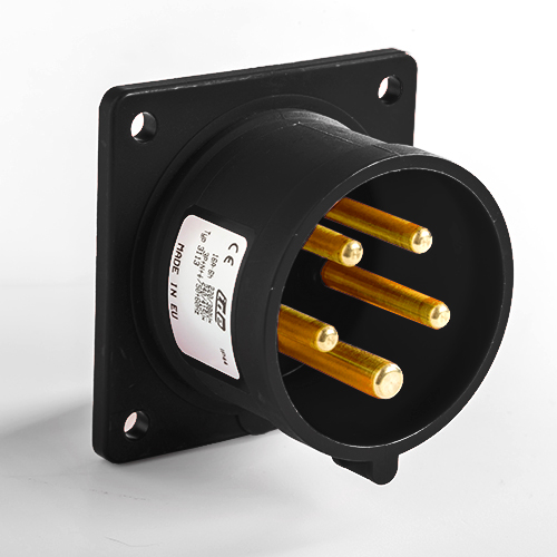 Clavija empotrar recta. Corriente nominal: 16A a una tensión de trabajo de 500VCA. Configuración de contactos: 3P+N+T. Código horario: 7h, color negro. Resistencia impacto: IK08. Material: poliamida 6 HF, cumple la directiva RoHS. Material contacto: latón. Grado de proteccón: IP44.