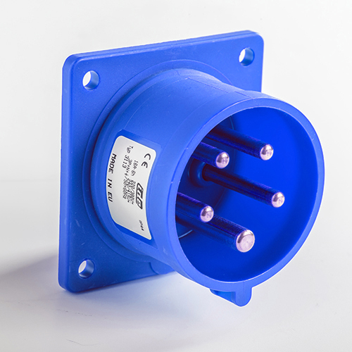 Clavija empotrar recta. Corriente nominal: 32A a una tensión de trabajo de 230VCA. Configuración de contactos: 3P+N+T. Código horario: 9h, color azul. Resistencia impacto: IK08. Material: poliamida 6 HF, cumple la directiva RoHS. Material contacto: latón. Grado de proteccón: IP44.