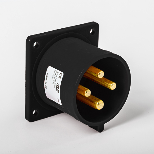 Clavija empotrar recta. Corriente nominal: 32A a una tensión de trabajo de 500VCA. Configuración de contactos: 3P+T. Código horario: 7h, color negro. Resistencia impacto: IK08. Material: poliamida 6 HF, cumple la directiva RoHS. Material contacto: latón. Grado de proteccón: IP44.