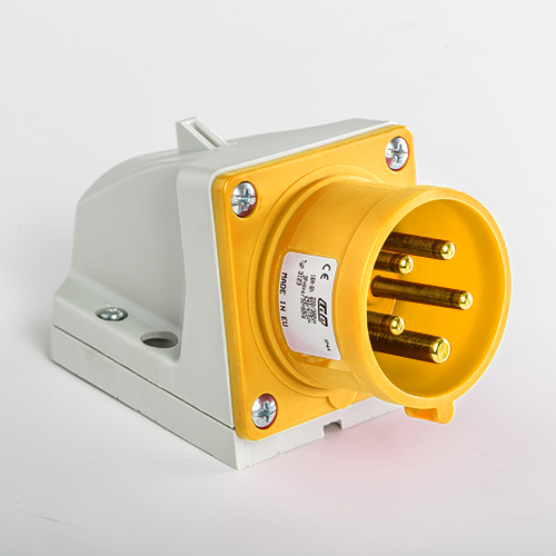 Clavija mural. Corriente nominal: 16A a una tensión de trabajo de 120VCA. Configuración de contactos: 3P+N+T. Código horario: 4h, color amarillo. Resistencia impacto: IK08. Material: poliamida 6 HF, cumple la directiva RoHS. Material contacto: latón. Grado de proteccón: IP44.