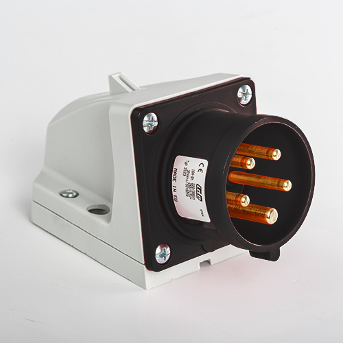 Clavija mural. Corriente nominal: 16A a una tensión de trabajo de 500VCA. Configuración de contactos: 3P+N+T. Código horario: 7h, color negro. Resistencia impacto: IK08. Material: poliamida 6 HF, cumple la directiva RoHS. Material contacto: latón. Grado de proteccón: IP44.