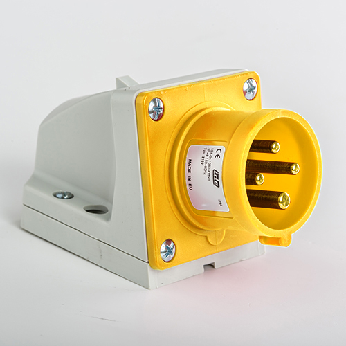 Clavija mural. Corriente nominal: 16A a una tensión de trabajo de 120VCA. Configuración de contactos: 3P+T. Código horario: 4h, color amarillo. Resistencia impacto: IK08. Material: poliamida 6 HF, cumple la directiva RoHS. Material contacto: latón. Grado de proteccón: IP44.