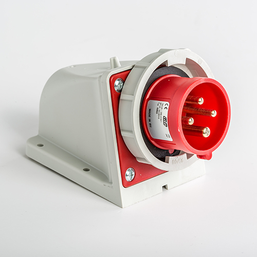 Clavija mural. Corriente nominal: 16A a una tensión de trabajo de 400VCA. Configuración de contactos: 3P+T. Código horario: 6h, color rojo. Resistencia impacto: IK08. Material: poliamida 6 HF, cumple la directiva RoHS. Material contacto: latón. Grado de proteccón: IP66-IP67.