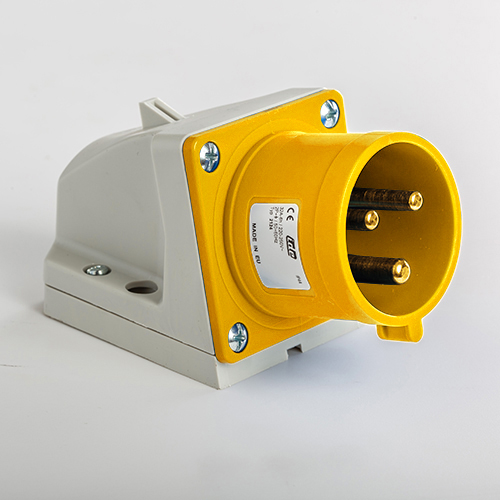 Clavija mural. Corriente nominal: 32A a una tensión de trabajo de 120VCA. Configuración de contactos: 2P+T. Código horario: 4h, color amarillo. Resistencia impacto: IK08. Material: poliamida 6 HF, cumple la directiva RoHS. Material contacto: latón. Grado de proteccón: IP44.