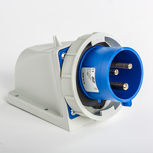 Clavija mural. Corriente nominal: 32A a una tensión de trabajo de 230VCA. Configuración de contactos: 2P+T. Código horario: 6h, color azul. Resistencia impacto: IK08. Material: poliamida 6 HF, cumple la directiva RoHS. Material contacto: latón. Grado de proteccón: IP66-IP67.