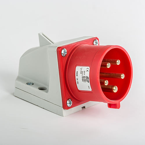 Clavija mural. Corriente nominal: 32A a una tensión de trabajo de 220/400VCA. Configuración de contactos: 3P+N+T. Código horario: 6h, color rojo. Resistencia impacto: IK08. Material: poliamida 6 HF, cumple la directiva RoHS. Material contacto: latón. Grado de proteccón: IP44.
