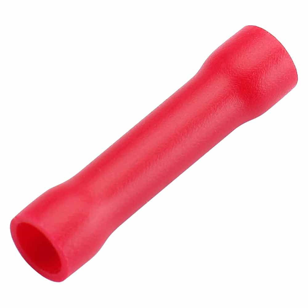 Conector a tope de cobre estañado con aislante de vinil. Indicado para un calibre de 0.5-1.5mm² (22-18AWG). Dimensiones: 24.6mm de longitud total, mm longitud de aislante. Empaquetado de 100 piezas. Color rojo. Aprobaciones: CE, UL