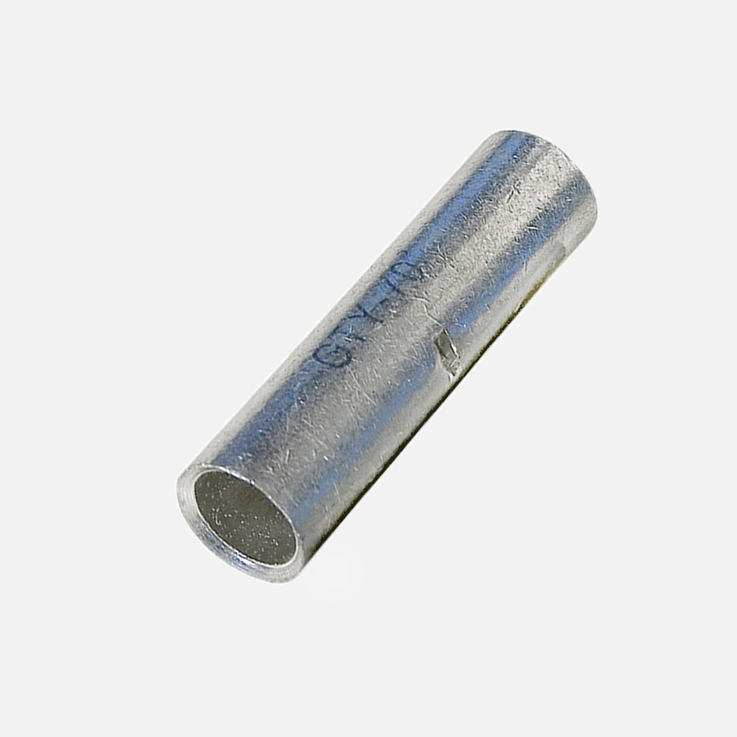 Conector de empalme tubular a tope desnudo. Cuerpo de cobre estañado. Indicado para un calibre de 10mm² (8AWG). Dimensiones: 30mm de largo y 4.5mm de diámetro de entrada de cable. Empaquetado de 100 piezas. Aprobaciones: CE, UL.