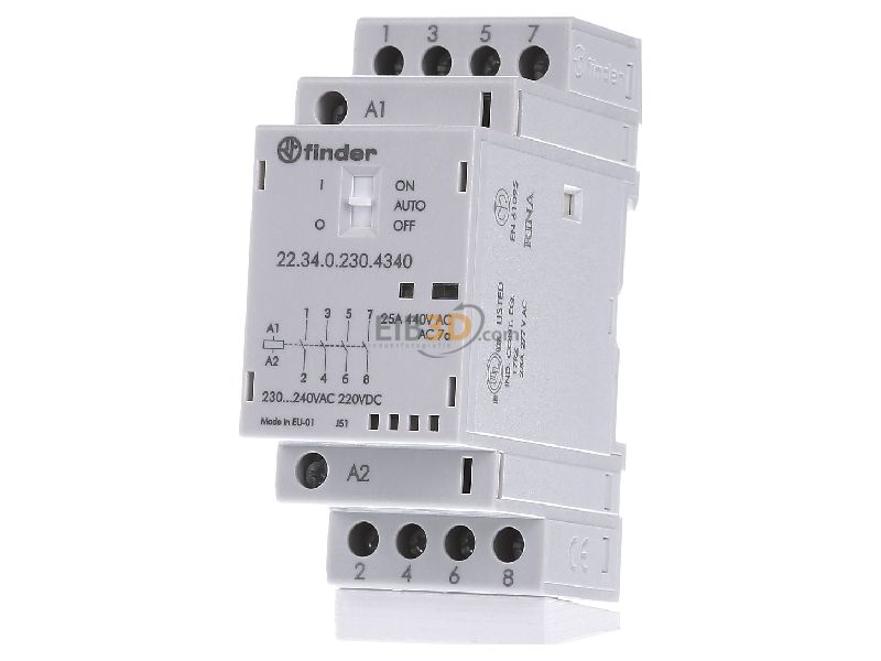 22.34.0.230.4340 Contactor modular. Específico para cargas de lámparas y cargas con altas corrientes de pico. Tensión de mando nominal de 230VVCA/CD. Contactos de plata oxido de estaño (AgSn02) con configuración 4NA. Indicado para corriente nominal de 25A a una tensión de 250/440VVCA. Vida útil mecánica 2x106 ciclos. Vida útil eléctrica AC-7a 30x10³. Montaje en carril DIN 35mm. Dimensiones: 88.8Hx35Wx60.8Dmm. Temperatura de operación de -25°C~50°C. Aprobaciones: CE, UKCA, EAC, IMQ, Lloyd's Register, RINA, UL. Protección IP20.