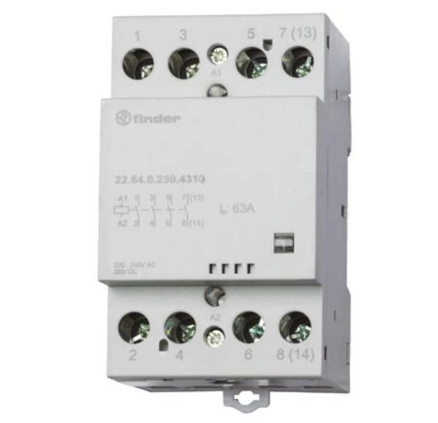 22.64.0.230.4310 Contactor modular. Pensado específicamente para cargas con corriente de arranque alta 240A. Tensión de mando nominal de 230VVCA/CD. Contactos de plata oxido de estaño (AgSn02) con configuración 4NA. Indicado para corriente nominal de 63A a una tensión de 400/440VVCA. Vida útil mecánica 3x106 ciclos. Vida útil eléctrica AC-7a 100x10³. Montaje en carril DIN 35mm. Dimensiones: 95.8Hx53.5Wx63.1Dmm. Temperatura de operación de -15°C~55°C. Aprobaciones: CE, UKCA, EAC, UL. Protección IP20.