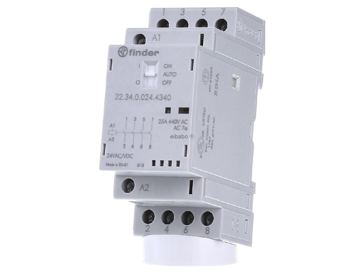 22.34.0.024.1340 Contactor modular. Apto para cargas resistivas, poco inductivas y cargas de motor. Tensión de mando nominal de 24VVCA/CD. Contactos de plata níquel (AgNi) con configuración 4NA. Indicado para corriente nominal de 25A a una tensión de 250/440VVCA. Vida útil mecánica 2x106 ciclos. Vida útil eléctrica AC-7a 150x10³. Montaje en carril DIN 35mm. Dimensiones: 88.8Hx35Wx60.8Dmm. Temperatura de operación de -25°C~50°C. Aprobaciones: CE, UKCA, EAC, IMQ, Lloyd's Register, RINA, UL. Protección IP20.