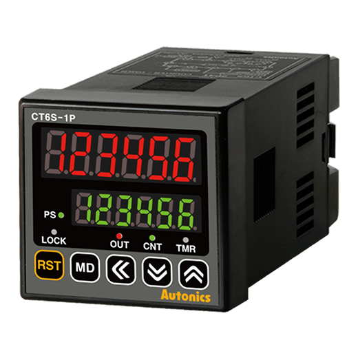 CT6S-1P4 Contador/Temporizador digital programable de 6 dígitos. Tamaño DIN 48WX48H y 90Dmm. Tensión de alimentación: 100-240VCA. Señal de entrada seleccionable PNP/NPN. Tipo de salida de control: Simple: 1NANC+ Salida SSR: NPN colector abierto. Método de operación: (contador)-Count up, down, up-down-; Operación de salida (temporizador): - On Delay, Flicker, interval, Off Delay, On-Off Delay, Integration time, etc.- ¡Revisar manual! Velocidad de conteo: 1, 30, 1k, 5k, 10k [cps]. Grado de protección: IP65.