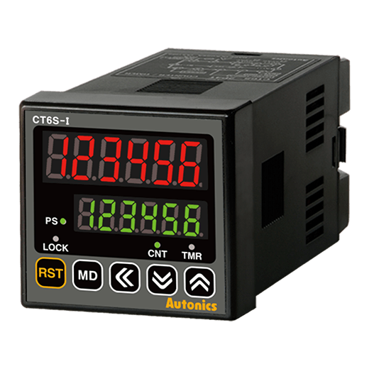 CT6S-I4 Contador/Temporizador digital programable de 6 dígitos. Tamaño DIN 48WX48H y 90Dmm. Tensión de alimentación: 100-240VCA. Señal de entrada seleccionable PNP/NPN. Tipo de salida de control: Indicador . Método de operación: (contador)-Count up, down, up-down-. ¡Revisar manual! Velocidad de conteo: 1, 30, 1k, 5k, 10k [cps]. Grado de protección: IP65.