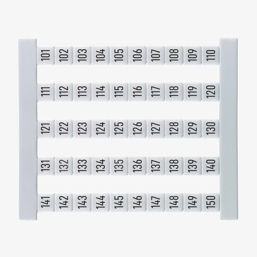 DEK 5 FS 101-150 Dekafix. Tablilla de identificadores o etiquetas para clemas de la serie SAK, W, P y Z. Cada tablilla contiene 50 etiquetas blancas con numeración consecutiva de 101-150 con orientación vertical. Cada etiqueta tiene un tamaño de 5Hx5Wmm y están fabricadas de poliamida 66, libre de halógenos, con grado inflamabilidad según norma UL 94 de V2. Indicado para una temperatura de trabajo desde -40°C hasta +100°C. Para más información, consulte la ficha técnica.