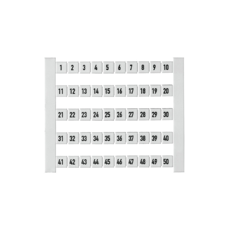 DEK 5 FW 1-50 Dekafix. Tablilla de identificadores o etiquetas para clemas de la serie SAK, W, P y Z. Cada tablilla contiene 50 etiquetas blancas con numeración consecutiva de 1-50 con orientación horizontal. Cada etiqueta tiene un tamaño de 5Hx5Wmm y están fabricadas de poliamida 66, libre de halógenos, con grado inflamabilidad según norma UL 94 de V2. Indicado para una temperatura de trabajo desde -40°C hasta +100°C. Para más información, consulte la ficha técnica.