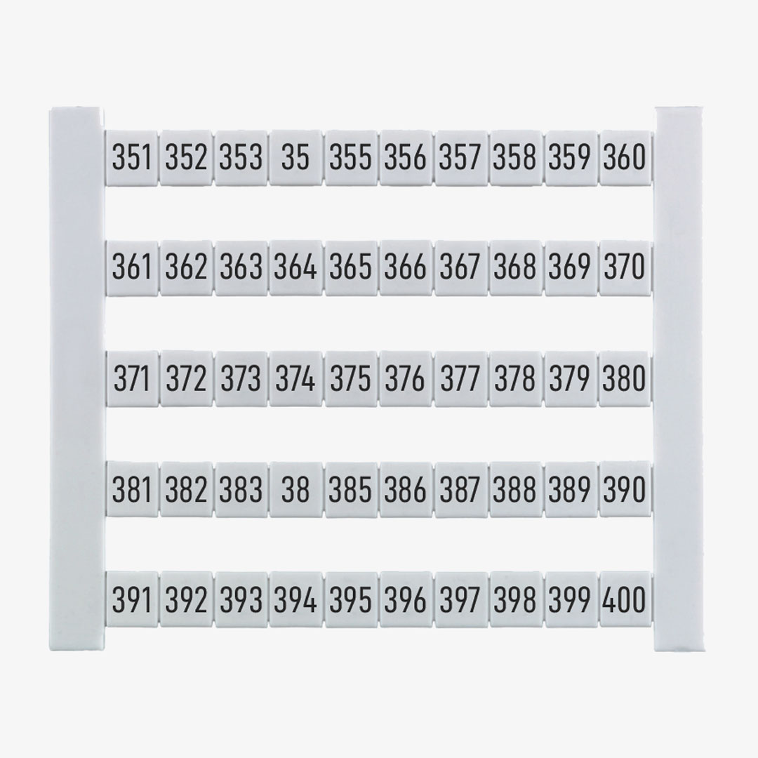 DEK 5 FW 351-400 Dekafix. Tablilla de identificadores o etiquetas para clemas de la serie SAK, W, P y Z. Cada tablilla contiene 50 etiquetas blancas con numeración consecutiva de 351-400 con orientación horizontal. Cada etiqueta tiene un tamaño de 5Hx5Wmm y están fabricadas de poliamida 66, libre de halógenos, con grado inflamabilidad según norma UL 94 de V2. Indicado para una temperatura de trabajo desde -40°C hasta +100°C. Para más información, consulte la ficha técnica.