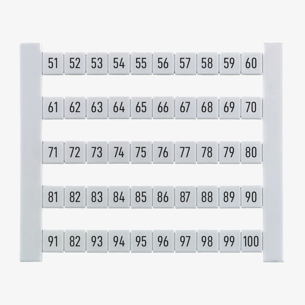 DEK 5 FW 51-100 Dekafix. Tablilla de identificadores o etiquetas para clemas de la serie SAK, W, P y Z. Cada tablilla contiene 50 etiquetas blancas con numeración consecutiva de 51-100 con orientación horizontal. Cada etiqueta tiene un tamaño de 5Hx5Wmm y están fabricadas de poliamida 66, libre de halógenos, con grado inflamabilidad según norma UL 94 de V2. Indicado para una temperatura de trabajo desde -40°C hasta +100°C. Para más información, consulte la ficha técnica.