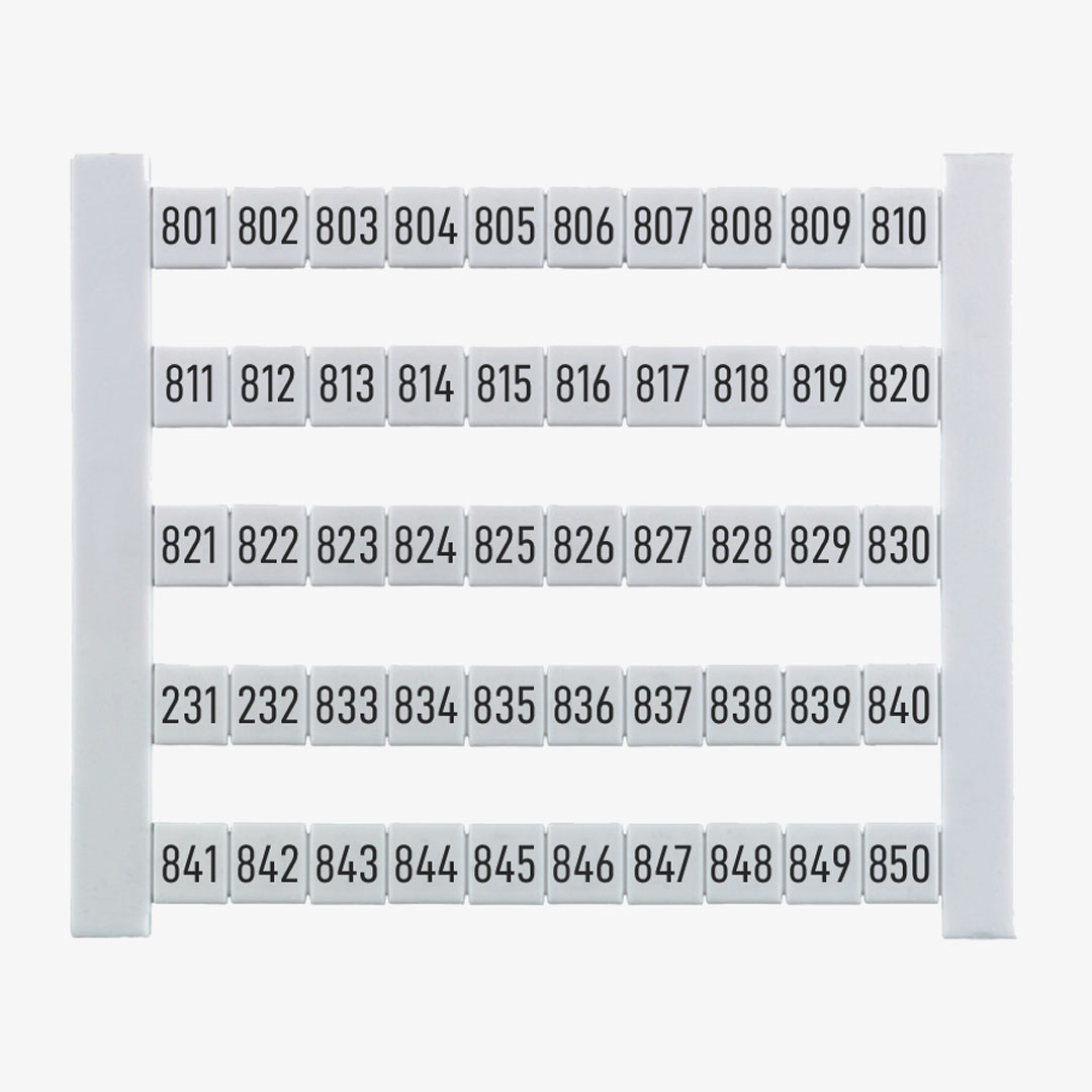 DEK 5 FW 801-850 Dekafix. Tablilla de identificadores o etiquetas para clemas de la serie SAK, W, P y Z. Cada tablilla contiene 50 etiquetas blancas con numeración consecutiva de 801-850 con orientación horizontal. Cada etiqueta tiene un tamaño de 5Hx5Wmm y están fabricadas de poliamida 66, libre de halógenos, con grado inflamabilidad según norma UL 94 de V2. Indicado para una temperatura de trabajo desde -40°C hasta +100°C. Para más información, consulte la ficha técnica.