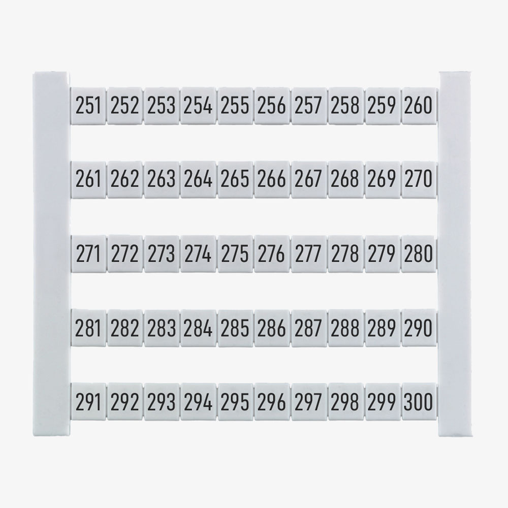 DEK 6 FW 251-300 Dekafix. Tablilla de identificadores o etiquetas para clemas de la serie SAK, W, P y Z. Cada tablilla contiene 50 etiquetas blancas con numeración consecutiva de 251-300 con orientación horizontal. Cada etiqueta tiene un tamaño de 5Hx6Wmm y están fabricadas de poliamida 66, libre de halógenos, con grado inflamabilidad según norma UL 94 de V2. Indicado para una temperatura de trabajo desde -40°C hasta +100°C. Para más información, consulte la ficha técnica.