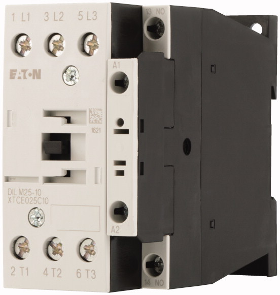 DILM25-10(380V50Hz,440V60Hz) Contactor trifásico con auxiliar 1NA, tensión de bobina de 440VCA, indicado para una carga de 25A, 2HP a 120VCA 1PH/7 1/2HP a 220VCA/15HP a 440VCA, temperatura de operación de -25/+60, grado de protección IP20, cumple con los estándares IEC/EN 60947, VDE 0660, UL, CSA.