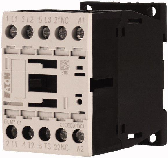 DILM7-01(230V50HZ,240V60HZ) Contactor trifásico con auxiliar 1NA, tensión de bobina de 240VCA, indicado para una carga de 7A, 1/4HP a 120VCA 1PH/2HP a 220VCA/3HP a 440VCA, temperatura de operación de -25/+60, grado de protección IP20, cumple con los estándares IEC/EN 60947, VDE 0660, UL, CSA.