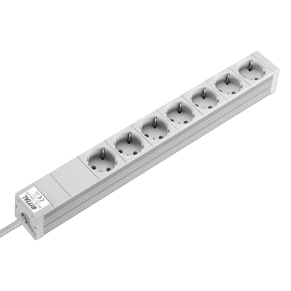 7240.210 DK Regletas de 7 enchufes en el canal de aluminio. Tipo conector Schuko. Sin interruptor basculante. Tensión de empleo: 250V. Color gris. Con cable de 2 metros.