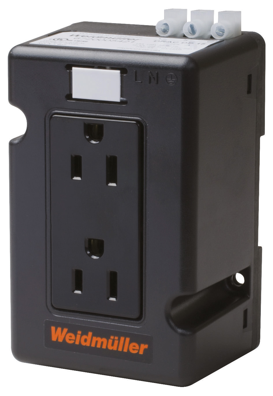 DRAC DP 15 Receptáculo duplex de carril DIN polarizado (L+N+PE). Tensión de trabajo nominal (AC): 125VAC. Corriente de trabajo: 15A.Capacidad nominal de corriente de cortocircuito ISCCR: 10kA. Temperatura de servicio: -35 °C…60 °C. Aprobaciones: TUL 508A, cULus