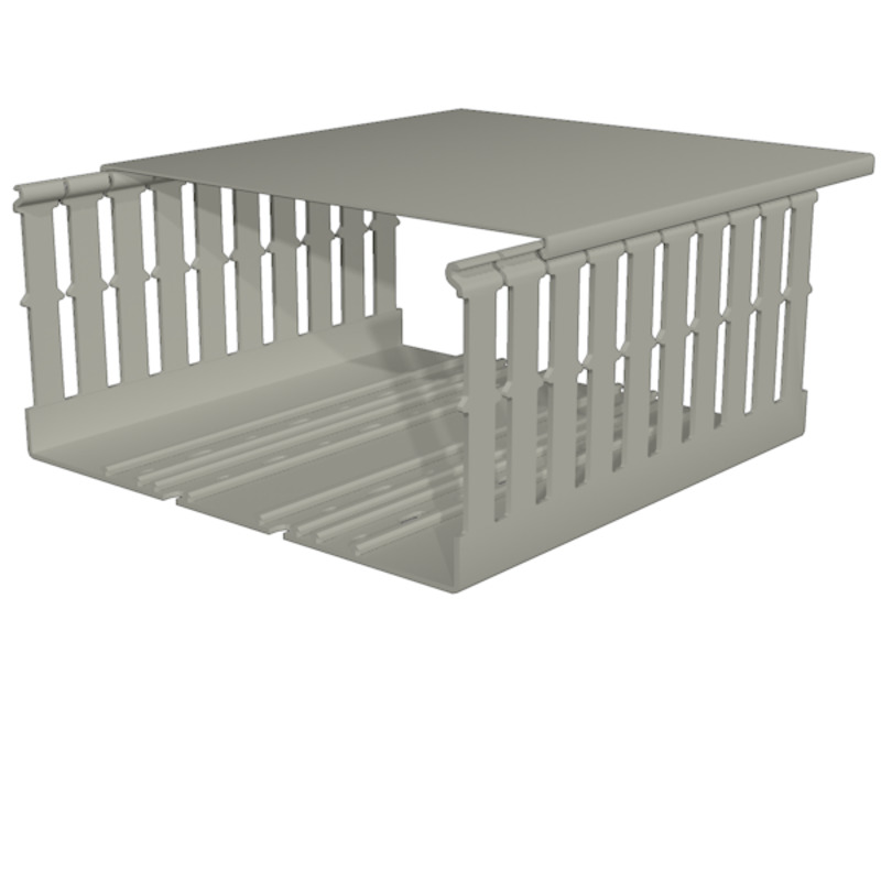 E39 Canaleta ranurada de 8mm con dimensiones de 150mm de base x 100mm de alto. El paso es de 20mm con lamas de 12mm de ancho. Se vende en presentaciones de 2 metros. Fabricadas de PVC rígido color gris (RAL 7030), auto extinguible clase 1 (UL94-VO). Dentro de sus características incluye doble línea de rotura, orificios en la parte inferior para la fijación, lamas redondas, entrada de cable redondeada y guías inferiores integradas.