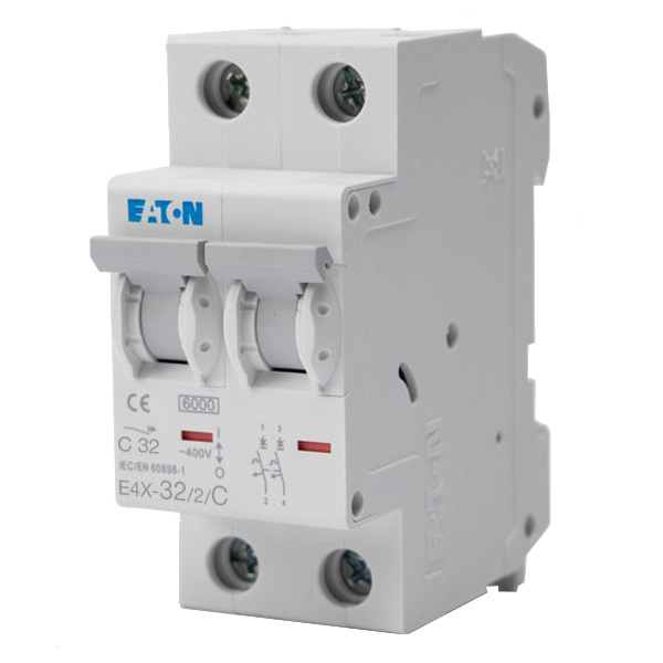 E4X-25/2/C E4X Interruptor automático termomagnético (disyuntor MCB). 2 polo(s). Corriente nominal: 25. Curva de disparo: tipo C. Capacidad interruptiva de acuerdo a IEC/EN 60898-1: 4.5kA. Tensión nominal: 240/415VCA. Montaje en riel DIN IEC/EN60715. Grado de protección: IP20.