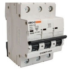 EBCHQ Interruptor automático termomagnético (disyuntor MCB). 3 polo(s). Corriente nominal: 6A. Curva de disparo: tipo C. Capacidad interruptiva de acuerdo a IEC/EN 60898-1: 10kA, IEC 60947-2: . Tensión nominal: 415VCA y CD por polo. Montaje en riel DIN IEC/EN60715. Grado de protección: IP20.