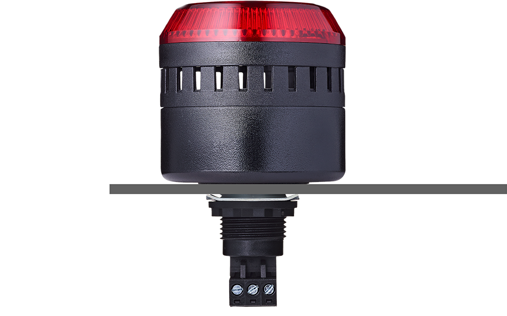 ELG Zumbador multitono montaje traspanel M22 con indicador LED. Diámetro de Ø65mm. Luz fija/intermitente. Señalización acústica clara de aprox. 103dB. Tensión de alimentación: 110-120VCA. Temperatura de operación: -25 °C ~+60 °C. Material: Policarbonato. Grado de protección: IP65.