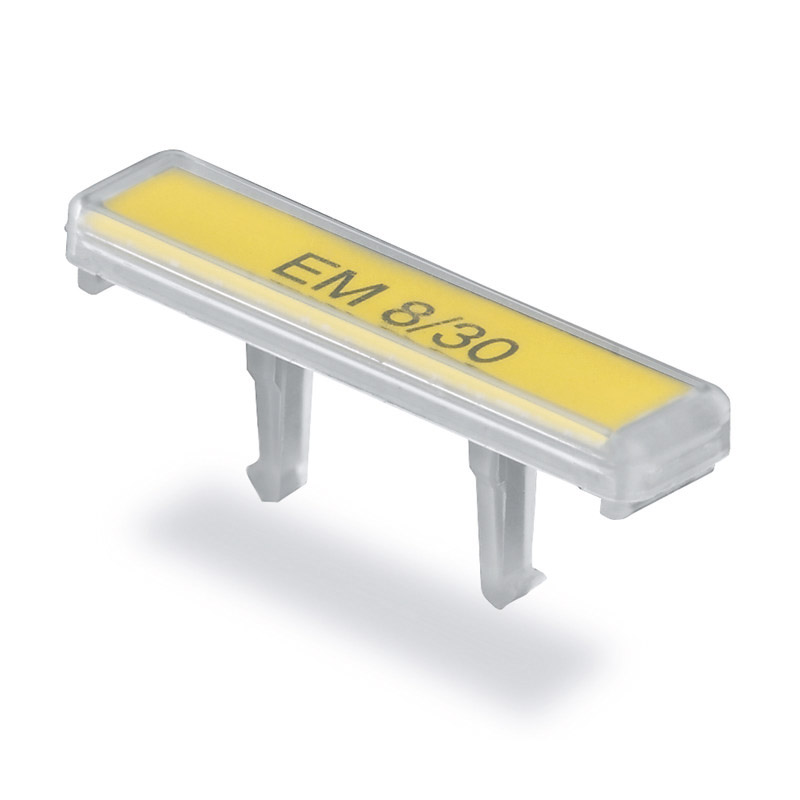 EM 8/30 EM. Porta etiqueta para etiquetas ESO, identificadores de clemas. Cada paquete contiene 50 porta etiquetas transparente de tamaño 32.40Hx7.2Wmm y están fabricadas de polipropileno, con grado inflamabilidad según norma UL 94 de HB. Indicado para una temperatura de trabajo desde -40°C hasta +80°C. Para más información, consulte la ficha técnica.