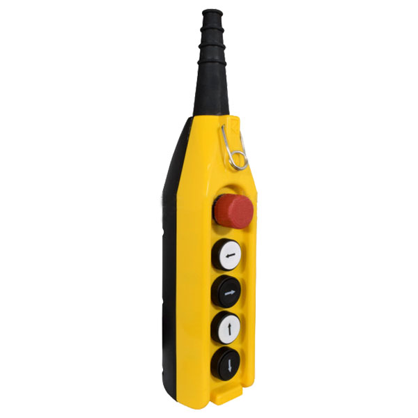 Estación de mando aérea. Pulsadores 2 blanco + 2 negros+1emergencia. Funciones de paro, arriba y abajo e izquierda y derecha. Conexión con tecnología tornillo. Color amarillo/negro. Configuración de los contactos: 4NA + 1NC. Corriente nominal: 4A a una tensión máxima de 230VCA. Grado de protección: IP65.