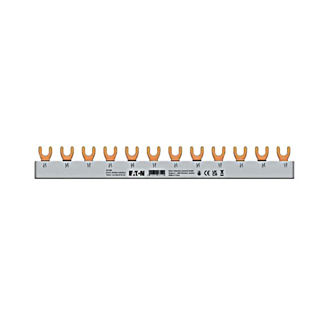 EVGK-3PHAS/12MODU Peine de conexión 10mm2. Tipo horquilla, con tapas finales, apto para cortar. 3 polo(s) (L1+L2+L3). Corriente nominal permanente: 63A. Número de espacios modulares: 12. Adecuado para 4 dispositivos. Indicado para usarse con PLS, CLS, PKN, PFIM, PFHM, PFNM. Resistencia nominal al cortocircuito: 25KA. Tensión nominal: 240/415VCA. Longitud: 210mm.