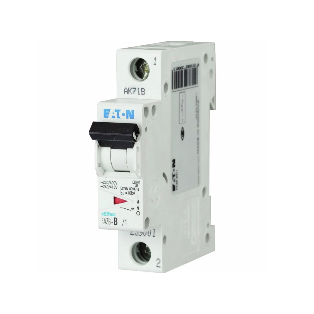 xEffect Interruptor automático termomagnético en miniatura (MCB) modelo FAZ6-B13/1. Diseño de 1 polo. Permite la protección a una corriente nominal de 13A, bajo la curva de disparo tipo B. Cuenta con capacidad interruptiva de 6kA de acuerdo al estándar IEC/EN 60898 y 10kA de acuerdo al estándar IEC 60947-2. Soporta una tensión máxima de empleo de 230VCA o 60VCD por polo. Especificado para el montaje en riel DIN. El interruptor proporciona un grado de protección IP20 y está fabricado bajo los estándares IEC/EN 60947-2, IEC/EN 60898-1, del mismo modo cuenta con las siguientes aprobaciones UR (UL 1077), CSA (CSA 22.2 No. 235), CE, ÖVE y EAC.