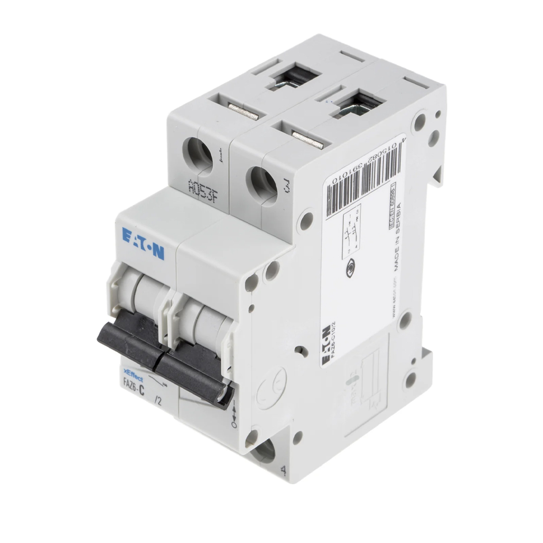 xEffect Interruptor automático termomagnético en miniatura (MCB) modelo FAZ6-C4/2. Diseño de 2 polos. Permite la protección a una corriente nominal de 4A, bajo la curva de disparo tipo C. Cuenta con capacidad interruptiva de 6kA de acuerdo al estándar IEC/EN 60898 y 10kA de acuerdo al estándar IEC 60947-2. Soporta una tensión máxima de empleo de 400VCA o 120VCD por dos polos en serie. Especificado para el montaje en riel DIN. El interruptor proporciona un grado de protección IP20 y está fabricado bajo los estándares IEC/EN 60947-2, IEC/EN 60898-1, del mismo modo cuenta con las siguientes aprobaciones UR (UL 1077), CSA (CSA 22.2 No. 235), CE, ÖVE y EAC.