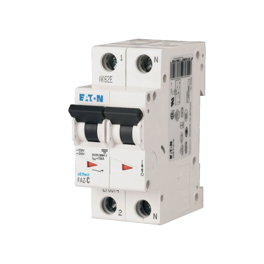 xEffect Interruptor automático termomagnético en miniatura (MCB) modelo FAZ6-C8/2. Diseño de 2 polos. Permite la protección a una corriente nominal de 8A, bajo la curva de disparo tipo C. Cuenta con capacidad interruptiva de 6kA de acuerdo al estándar IEC/EN 60898 y 10kA de acuerdo al estándar IEC 60947-2. Soporta una tensión máxima de empleo de 400VCA o 120VCD por dos polos en serie. Especificado para el montaje en riel DIN. El interruptor proporciona un grado de protección IP20 y está fabricado bajo los estándares IEC/EN 60947-2, IEC/EN 60898-1, del mismo modo cuenta con las siguientes aprobaciones UR (UL 1077), CSA (CSA 22.2 No. 235), CE, ÖVE y EAC.