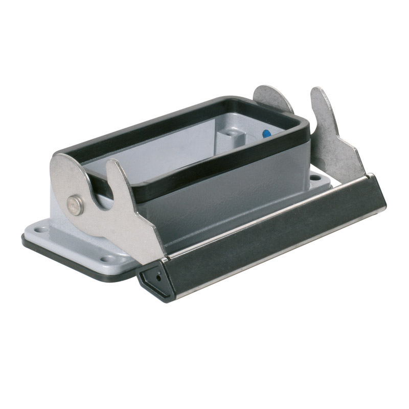 HDC 16B ALU RockStar. Diseño B. Base abierta para insertos de 16P. Un gancho. Abrazadera longitudinal como sistema de bloqueo. Grupo 6. Material principal de la base: aluminio. Grado de protección (enchufado): IP65 y NEMA 12, 4X. Temperatura de operación: -40°C~125°C.