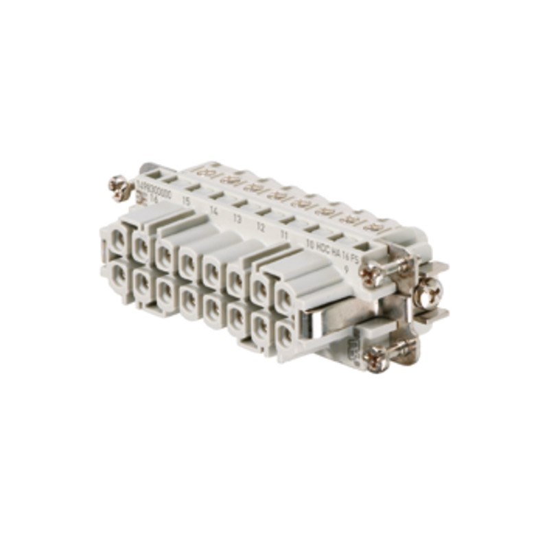 HDC HA 16 FS RockStar. Serie HA. Inserto hembra delgado de polos fijos. Numero de polos: 16P+PE. Corriente: 16A a una tensión de 250V. Grupo 5. Aleación de cobre, plata pasivado. Conexión tipo tornillo. Rango de calibre del conductor: 0.5-2.5mm²/20-14AWG. Temperatura de operación: -40°C~125°C.