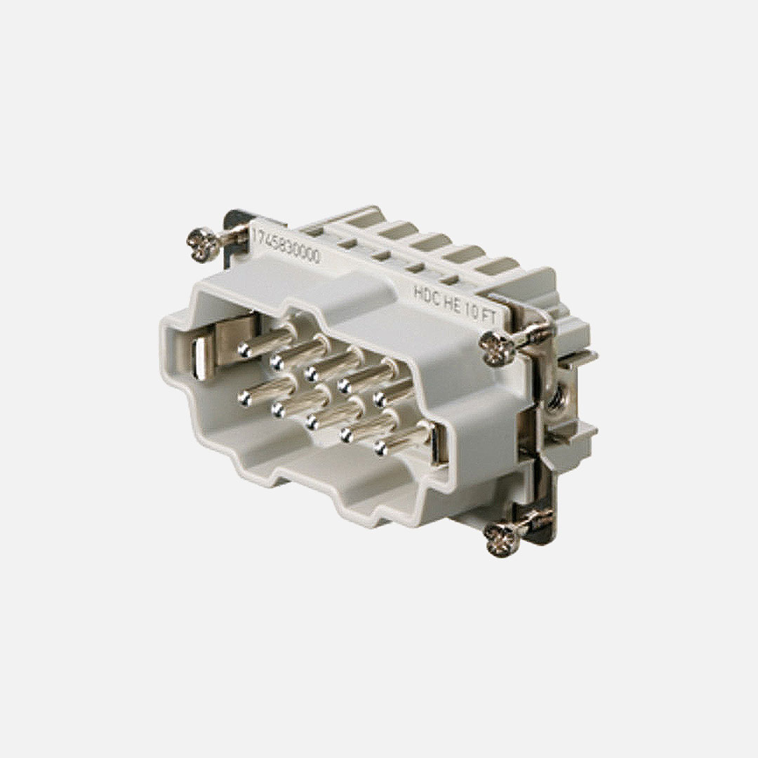 HDC HE 10 MT RockStar. Serie HE. Inserto macho universal de polos fijos. Numero de polos: 10P+PE. Corriente: 16A a una tensión de 500V. Grupo 4. Aleación de cobre, plata pasivado. Conexión tipo directa. Rango de calibre del conductor: 0.25-2.5mm²/24-14AWG. Temperatura de operación: -40°C~125°C.